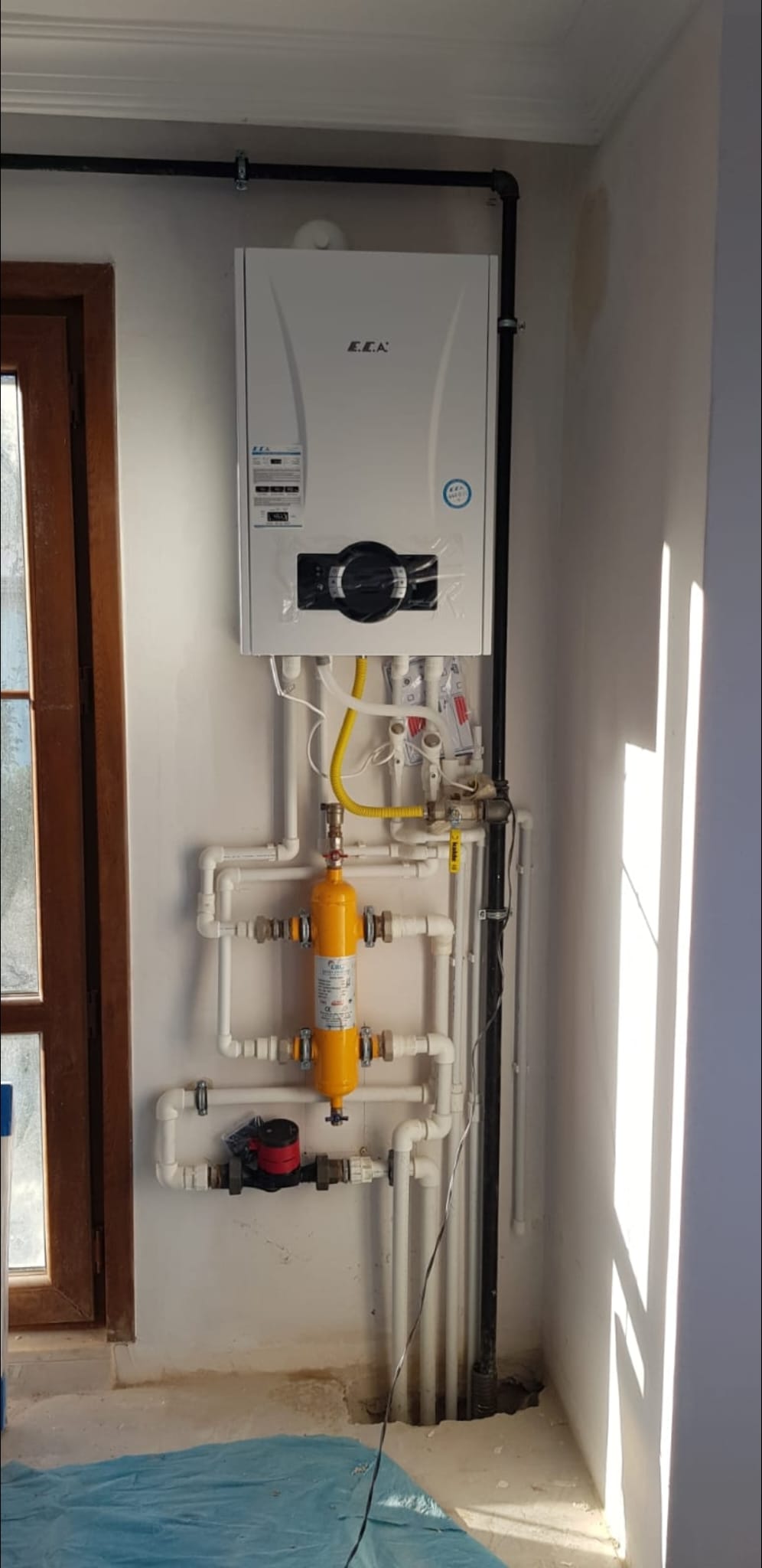 Gaz bağlantısı, baca çıkışı ve su tesisatı kontrolleriyle güvenli kombi montaj süreci.